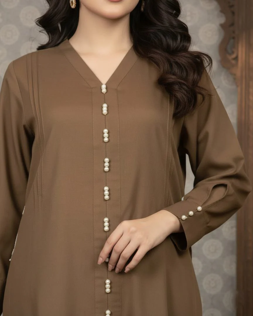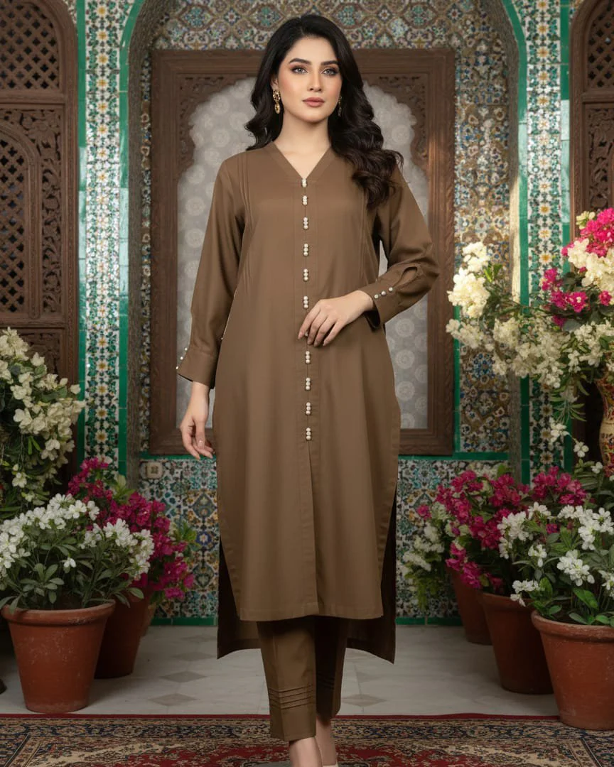Emberwood 2 Piece Premium Stitched is designed for women who want a perfect blend of winter comfort and elegant style. Crafted in warm earthy brown, this stitched two-piece features a straight-cut kurta with a V-neckline, three-quarter sleeves, and matching trousers for a cohesive look. Delicate white embroidery and decorative buttons add subtle heritage charm, while the soft Double Toon fabric keeps you cozy and stylish.