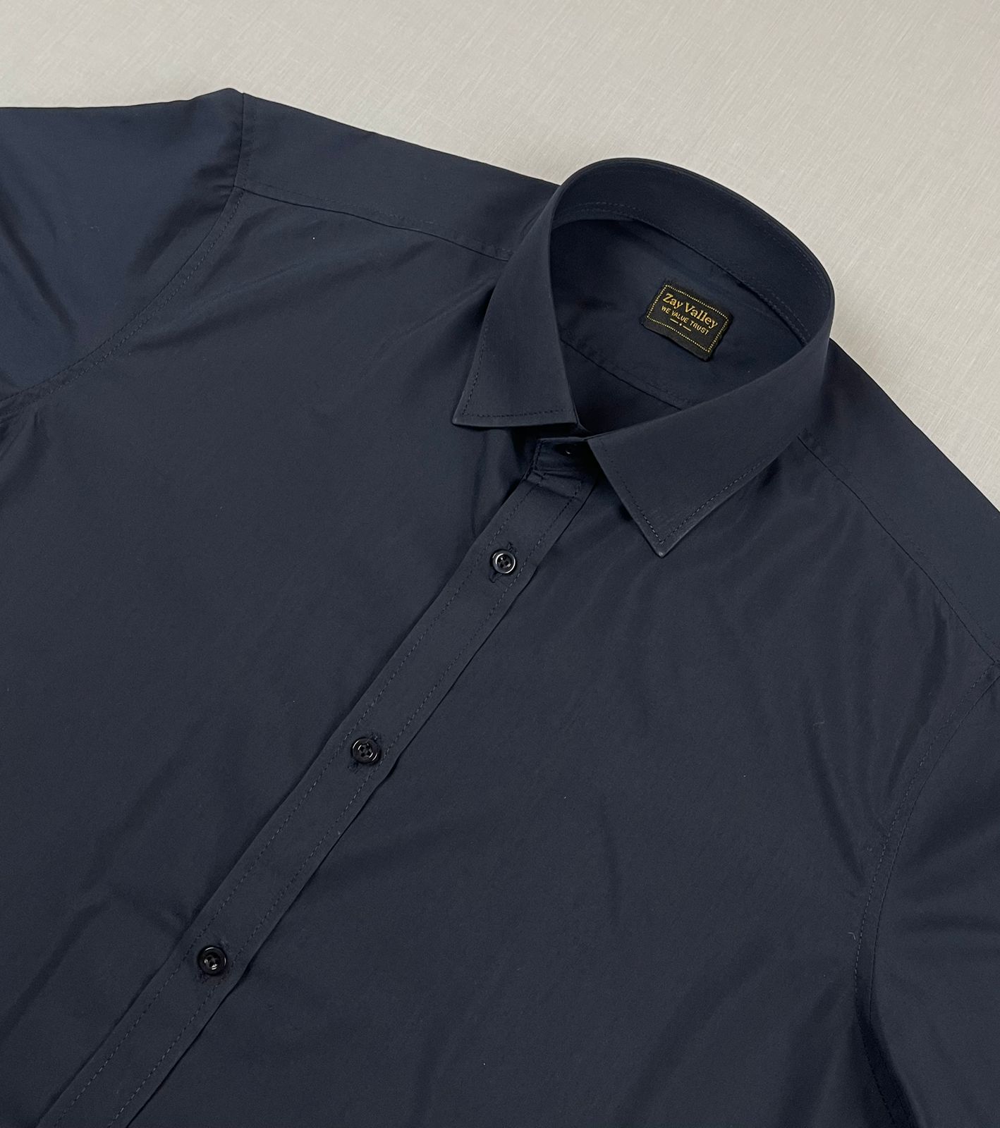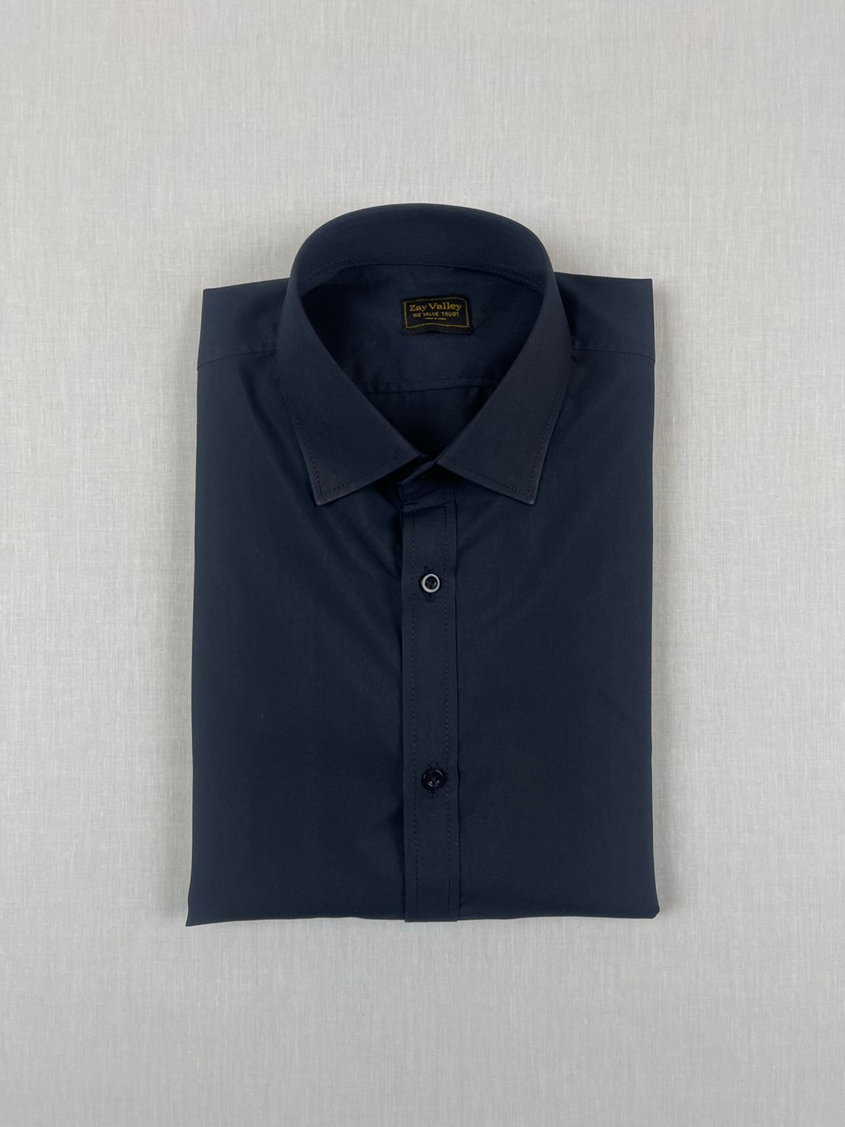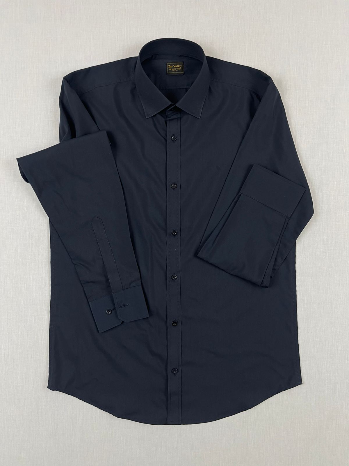 This is a practical, versatile dark navy dress shirt from Zay Valley. The color is a deep, sophisticated midnight blue, almost black. It works for formal and professional settings.