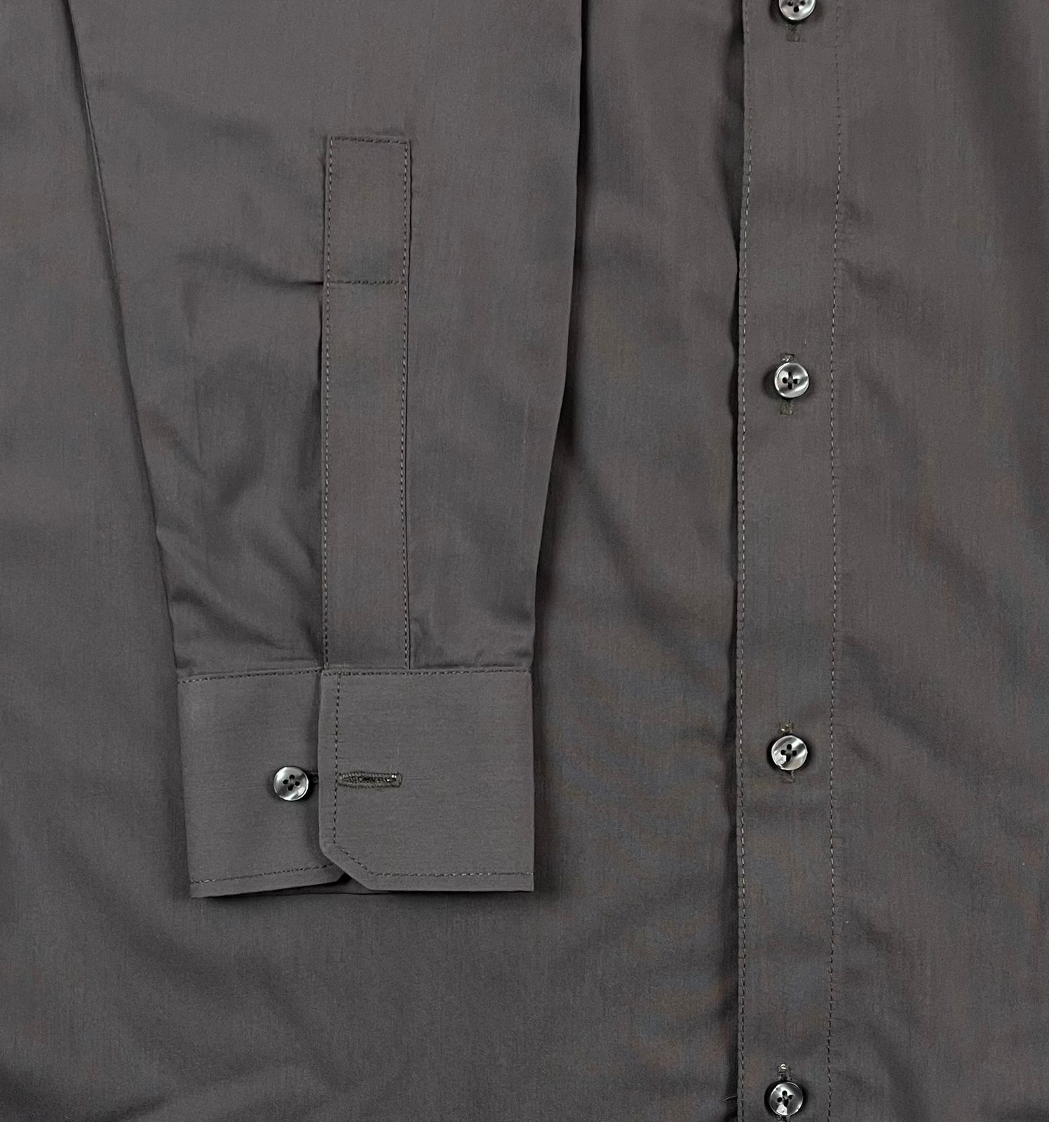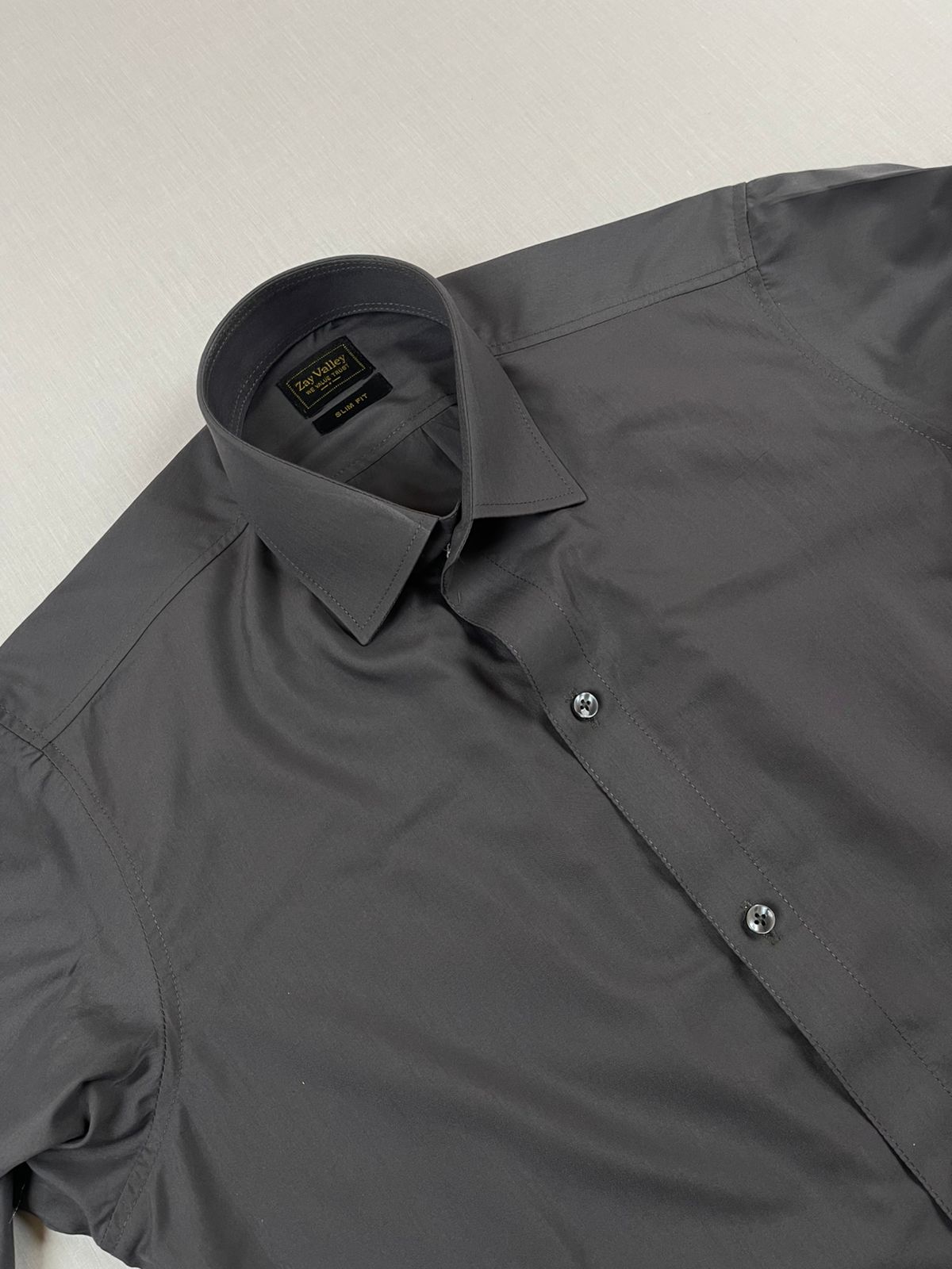 This deep charcoal grey dress shirt offers sharp style and a tailored fit. Wear it for business meetings or formal dinners. It combines classic features with a modern silhouette.